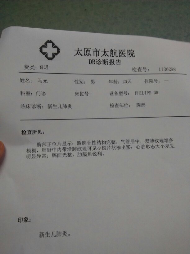 昨天去洗澡,发现有鼻塞!拍了胸片,诊断为新生儿肺炎! 点击展开 匿名用户 2015-08-31 12:20 满意回答 目前胸片是明确支持肺炎诊断的,肺炎建议是输液铜怠清治疗的,而且新生趋抓儿大多都是要住院的,也有门诊治疗的。当然如果宝宝只是鼻阻,没有其他任何表现。精神胃口都好司药,一般1周左右就会好的 cn#GfpkVaQau 2015-08-31 12:28 宝宝知道提示您:回答为网友贡献,仅供参考。 相关问题 我儿子刚生第5天,医生听诊说是新生儿肺炎,叫住院治疗,然后我去拍了一个胸片,结果是,检查所见: 新生儿,有点鼻塞,睡觉嘴巴有点吐泡泡,爱睡觉,肯吃奶,但医生说她可能有新生儿肺炎,要转保温箱,但问 儿子今天出生三天了,出生时医生说是脐带绕颈一圈造成孩子缺氧,胎心也不好,在监护室呢,今天做个磁共振和胸片,胸片诊断新生儿肺炎,磁共振说缺氧性脑病,跪求医生解答!