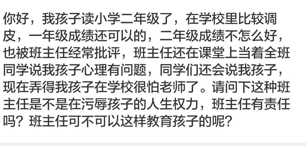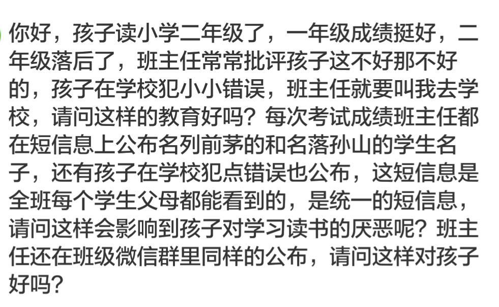 这种教育方式有问题,这个老师也有问题 首先他就没有尊重你的孩子,在大家面前说你孩子心理有问题,这已经不是为人师表可以说出的话了 再来,动不动就叫家长去学校,证明他没有处理事情的能力 还有统一的短信公布倒数排名的学生,这些事情都说明他根本没有考虑孩子们的心理 这种老师,就算教学能力再强,也教不好孩子怎...