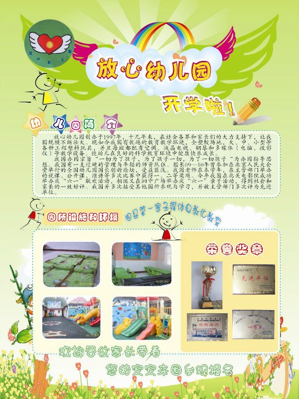 幼儿园招生宣传单简单设计 幼儿园宣传单简单设计,只要您有模板,按着做,差不多就行了,有卡通背景什么的,类似下面这图的,主要网站上免费的模板太少,我PS又不精通,求大神。 点击展开 匿名用户 2013-08-06 16:27 为您推荐: 其他回答 梅迪设计,打我手机号。 匿名用户 2013-08-07 13:22 相关问题 幼儿园招生宣传单是用什么软件做的 幼儿园十周年庆典设计主要突出什么意义比较好? 哪里有包免费设计的幼儿园纪念册做