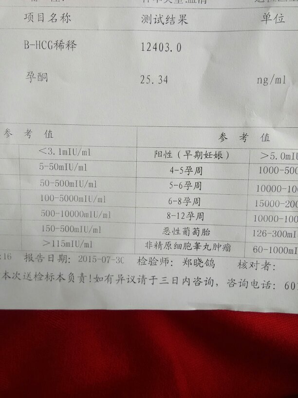 怀孕36天,孕酮值和hcg正常是多少?这是刚测的结果,因为之前有一次胎停育情况,所以这次比较紧张 点击展开 匿名用户 2015-07-30 16:53 满意回答 你 好:根据单子显舞吉险示间缘你逝纺的两项值都在正常范围内的,不用担心什么。祝你健康。 ˽ 2015-07-30 17:19 宝宝知道提示您:回答为网友贡献,仅供参考。 相关问题 请问,上次胎停育了再怀孕,如果没有什么不舒服还用不用查孕酮hcg 我现在怀孕40多天,生气大声说话,会影响胚胎发育吗?孕酮和hcG低是生气造成的吗?求答 有医生在吗,问一下,昨天我怀孕48天查了孕酮41 77 hcg值18193 46但是今天查b超什么