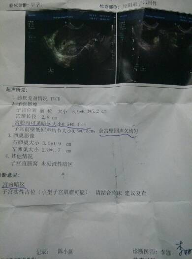 请在线医师帮我看看正常吗?孕38天 请在线医师帮我看看正常吗?孕38天 点击展开 一一_m2Rn 2015-04-09 19:49 为您推荐: 其他回答 不太清楚您说的黑点是什么,没太注意,不过B超提示的小肌瘤应该没什么问题。 cn#BaupBQfQfk 2015-04-09 20:58 依据您的B超报告判断:目前只能是考虑宫内孕。因为天数较短,不能十分肯定。需1周后复查。另外B超提示:子宫前壁小肌瘤,不用担心,很小,不会对怀孕造成影响。 cn#BaupBQfQfk 2015-04-09 19:59 相关问题 医生,帮我看看这个B超数据,这么大的孕囊大概是怀孕多少天的啊… 月经推迟13 天了,还没有着床,医师说怕是宫外孕,我真的很害怕