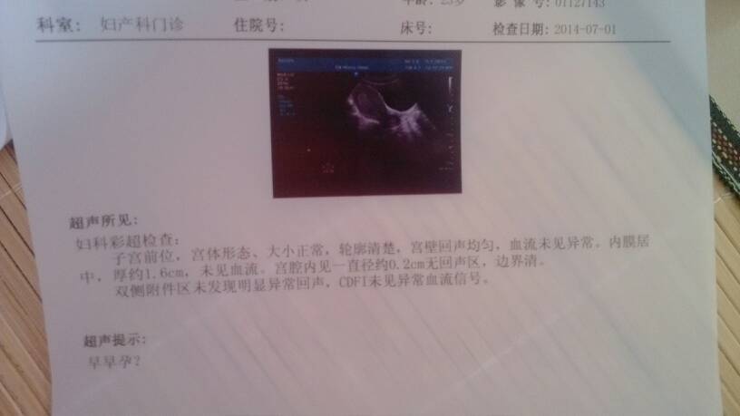 子宫和附件都是正常的,在宫腔内见到了一个类似妊娠囊的回声,但可能是因为怀孕时间较短,不能确定是不是怀孕,可以测个试纸看看,1-2周后再做个B超看看。