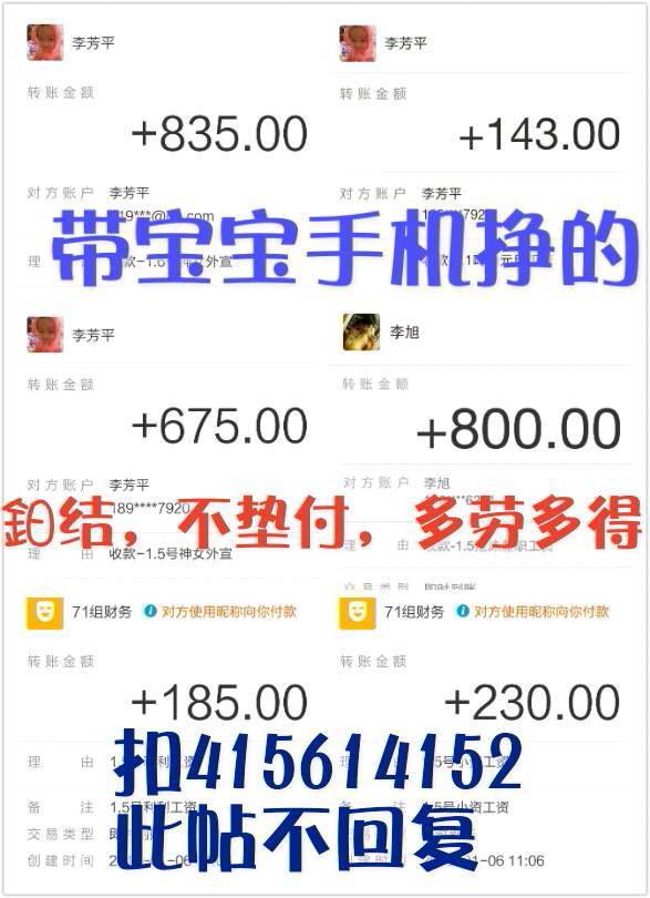 有没有宝妈在家带宝宝想找工作的呢?不用垫付,做得多挣得多 手机电脑都可以 没有时间限制,图上有抠加 有没有宝妈在家带宝宝想找工作的呢?不用垫付,做得多挣得多。手机电脑都可以。没有时间限制,图上有抠加抠了解,此处不回复。uj 点击展开 en_6SWC 2015-01-30 07:34 为您推荐: 其他回答 赚金币,,, 侬@偶※依靠 2015-01-30 07:42 相关问题 怀孕了玩电脑是不是会导致畸形?我现在2个多月 几乎都是在碰电脑和手机 那这个小孩能要吗?这图是一 有没有宝妈从怀孕到生都玩手机电脑呢,宝宝生下来正常吗