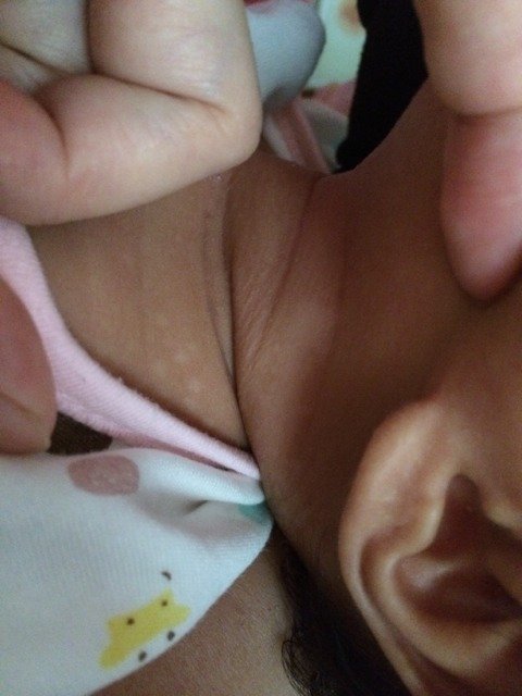 两个月大的宝宝纯母乳喂养,不知怎么的脖子和肩膀处都长了白色的坨,刚开始的时候是红色的,而且只有左边