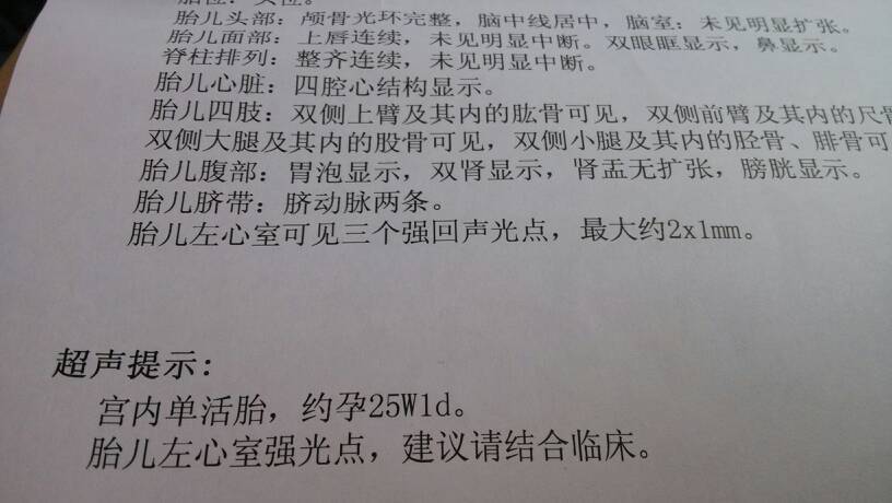 24周+1,今天四维检查,左心室可见三个强回声光点,最大约2×1mm,有跟我一样的宝妈吗?急急 24周+1,今天四维检查,左心室可见三个强回声光点,最大约2×1mm,有跟我一样的宝妈吗?急急。。。。。 点击展开 给我£晴天般的笑容 2014-05-22 21:33 为您推荐: 其他回答 病情分析:你好,你的情况考虑是怀孕的时间不是很长的情况,建议2周后进行复查,是不是有畸形的情况是比较合适的 我的龙宝是吃货 2014-05-22 21:35 相关问题 26周做四维左心室有0 2x0 2cm点的强回声有问题嘛?会不会对宝宝心脏有毛病啊?急!急 今天去医院检查 见习医生说 21周要做三维彩超 请问宝妈到底是做三维好还是四维好 宝妈们都是多少周做的四维彩超啊?妇产科医生让我今天去做,我是22周+4 天 但是彩超医生却