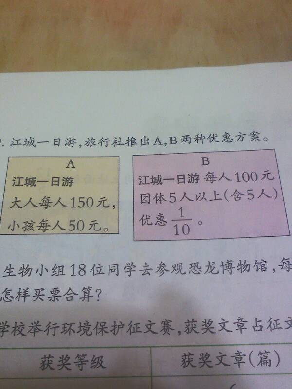 如果不能大人和小孩分开选方案,那方案A更省钱 方案A:2*150+4*50=500 方案B:悼朗6*100*(1-1/10)=540 如果不足5人也可以参加方案B,且可以分开选,则: 小孩参加方以间急案A,大人参加方案B(可以和陌生人凑数吗?)吉舞,400元