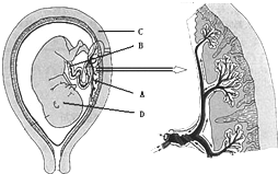 (1)图中B脐带C子宫. (唉炼2)人的精子与卵细胞在输卵管处相遇并结合形成受精卵,随后受精卵开始发育成最初的胚胎,此时发育的营养物质来自卵黄. (3)受精卵不断进行分裂,逐渐发育成胚泡;胚泡缓慢地移动到子宫中,最终植入子宫内膜,这是怀孕,在胚胎与子宫壁接触的部分形成了胎盘,胎盘与婴儿的脐带卜布相满渐掏连. (4)当受精卵发育成胎儿后,通过胎盘、脐带从母体获得所需要的氧和营养物质;胎儿每时每刻产生的二氧化碳等废物,也是通过胎盘经母体排出的.故答案为:(1)脐带、子宫(2)卵黄(3)胎盘(4)氧、营养物质