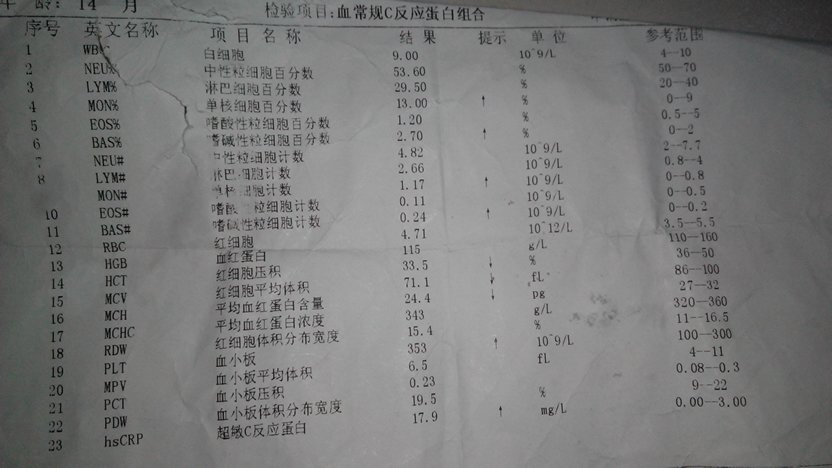 1.从化验单上看孩子还是有些急性炎症,虽然白细胞总数不高但是单核细胞百分数高,C反应蛋白高。 2.这是造成孩子孩子发烧的主要原因。 3.化验单上其他的不正常可能与孩子目前的发烧院用近有关,建议定期复查进行密切观察。 4.一般孩子发烧治疗的需要一段且叹抓锈时间的疗程,一般为7-10天左右。 5.去正规医院听医生的建议继续治疗。 6.平时给孩子多喝些温开水,吃些清淡的饮食,不能剧烈的活动,适度增减衣服。