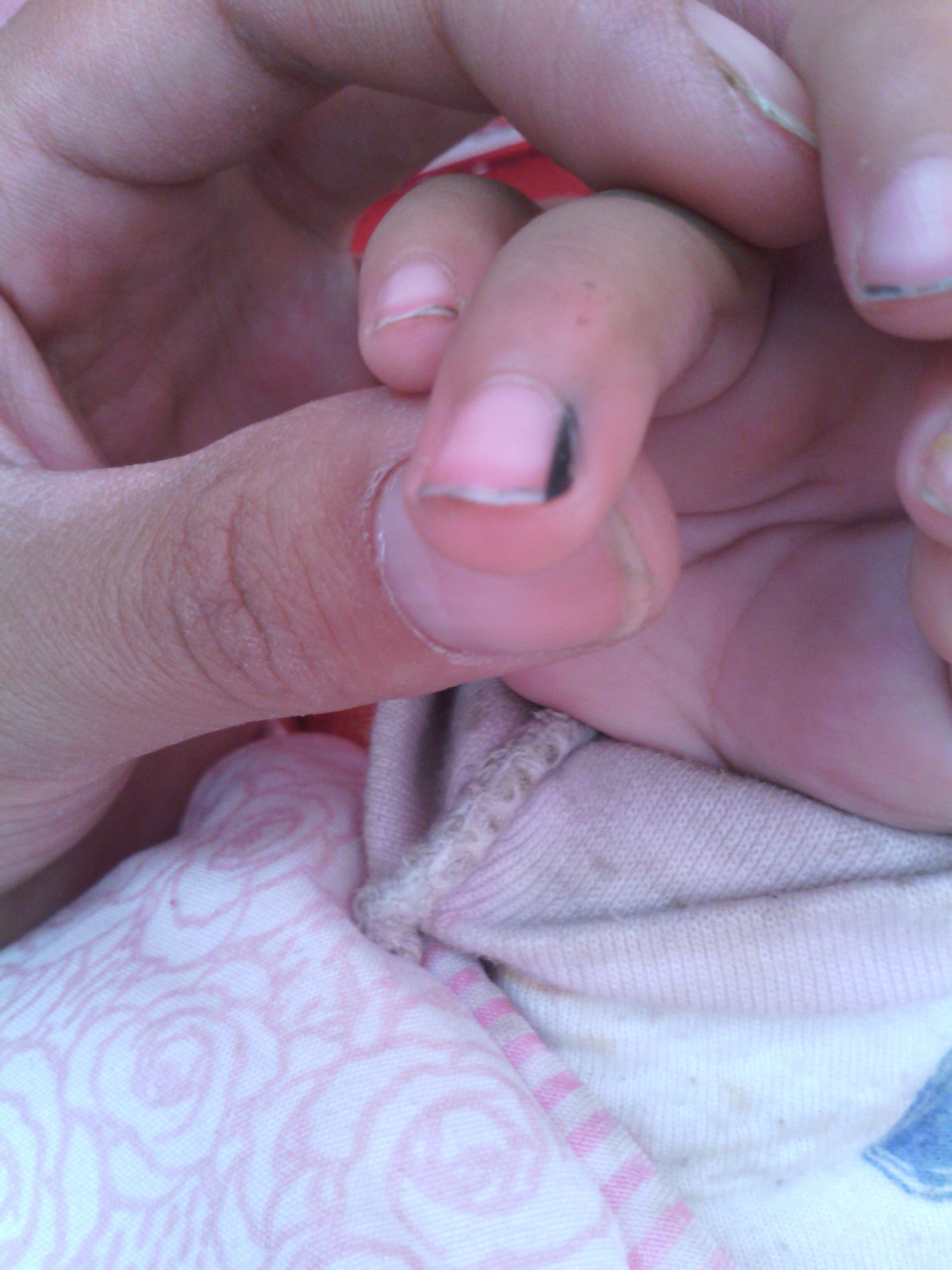 最近发现家里10个月宝宝右手无名指的内侧指甲上有一道黑色的 发现时到现在已经2个月了,现在还是黑色的 点击展开 匿名用户 2014-10-15 12:09 为您推荐: 其他回答 可能是胎记·· 匿名用户 2014-10-15 13:42 相关问题 你好,宝宝4个月,右手无名指指甲外侧的小肉肉发红,不知是不是指头炎,怎么处理呢 宝宝50多天了,昨天给宝宝剪指甲,不小心剪到肉了,出了一点血,现在红红的,怎么办 我怀宝宝最后一个月的时候开始出现手麻,两只手都麻,去检查时问医生说:生过自然好 现在我生过宝宝10