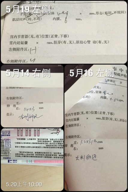 大夫你好 我末次月经5月5号 之后分别在5月14、5月16、和5月19去医院做了卵泡监测 B超结果入下图 但均未发现优质卵泡 今天上午十点自己用试纸却测到了强阳 并且昨天早上开始 尿尿都带粉色血 一直持续到现在都还有 请问大夫这是怎么回事 到底排卵没排卵?谢谢大夫 祝您端午节快乐!