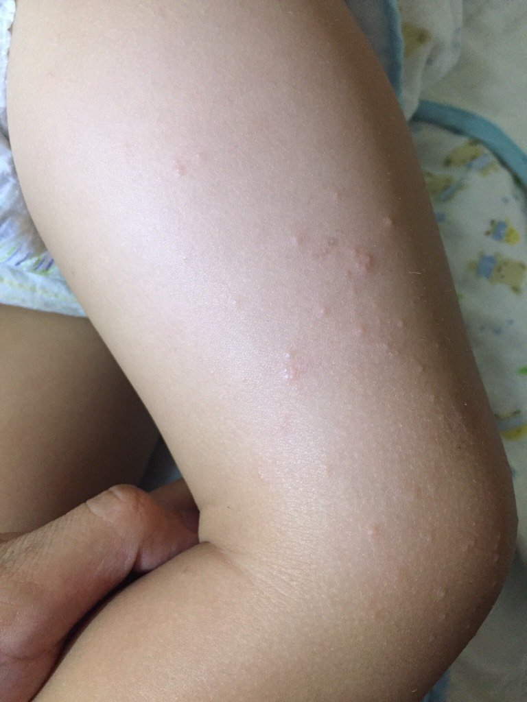 17个月的宝宝腿上和膝盖上起了小颗粒,硬性的,一周多了,前几天一直阴天下雨,湿度很大 这几天下去几