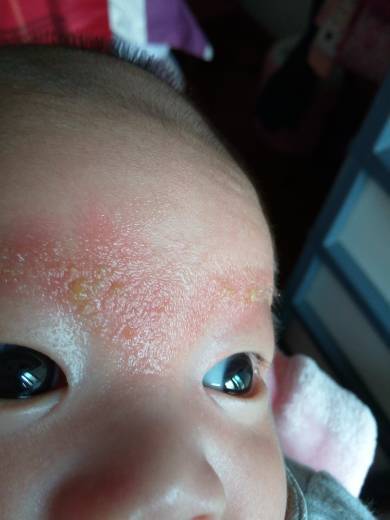 请帮忙看看宝宝眉头这儿是湿疹吗?是什么原因造成的,涂什么会好?