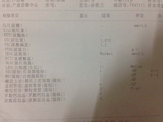 请有经验的医生帮我看看我这个尿检正不正常 万分感谢 请有经验的医生帮我看看我这个尿检正不正常。万分感谢 点击展开 健👼康 2015-01-12 16:02 为您推荐: 其他回答 多注意休息 Love smile giggle 2015-01-12 22:21 你好,这是一份正常的尿常规化验单,请问您有什么症状,把您的病史和你临床的表现具体说一下好吗。只有详细的病历资料我才能帮助您分析病情的。 江南0317 2015-01-12 20:54 去产检可以给医生看 亲亲你我 2015-01-12 19:15 白细胞2+,也许有点感染 陆_小曼 2015-01-12 17:16 不清楚、、、 遗失的爱? 2015-01-12 17:02 加载更多 相关问题 孕3月尿检结果,这几个指标高了是什么原因呢,医生说正常 怀孕32周了,谁帮我看看B超和尿检的数据正不正常