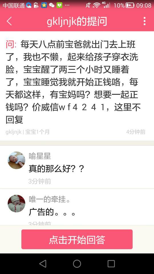 这个人天天打广告,从八点就发,直到现在同一条信息发了十四次,看着就烦,之前也是他他,现在换了名字 这个人天天打广告,从八点就发,直到现在同一条信息发了十四次,看着就烦,之前也是他他,现在换了名字,天天叫加微信号 点击展开 可爱&的小不点 2015-09-15 09:11 为您推荐: 其他回答 哈哈,不要里她就好 匿名用户 2015-09-15 16:19 是的,你可以举报 茜豪妈妈 2015-09-15 14:48 烦人的很哈 匿名用户 2015-09-15 14:14 管理员都不管 炚睿妈咪 2015-09-15 14:04 无视就好,, 最爱你笑 2015-09-15 11:18 加载更多 相关问题 最近宝爸总是在忙,我也不知道他到底在忙什么,每次发信息给他他都嫌我烦,都没有发过信息给我,你们说他 和老公吵架时老公说了粗话不好听,因为我一天打个电话给他他闲烦有什么事回家说,他还说以后再也不接我电话,再接我电话就把名字倒过来写,他说出这么绝情的话我放心里了 从来没怀疑过老公,可是今天,我在他脖子上发现草莓了,很小,当时问他他说不知道怎麽弄得,后来连续再问他就烦了,说我没点数,就凭这个说他外面有人了是不是太武断了?