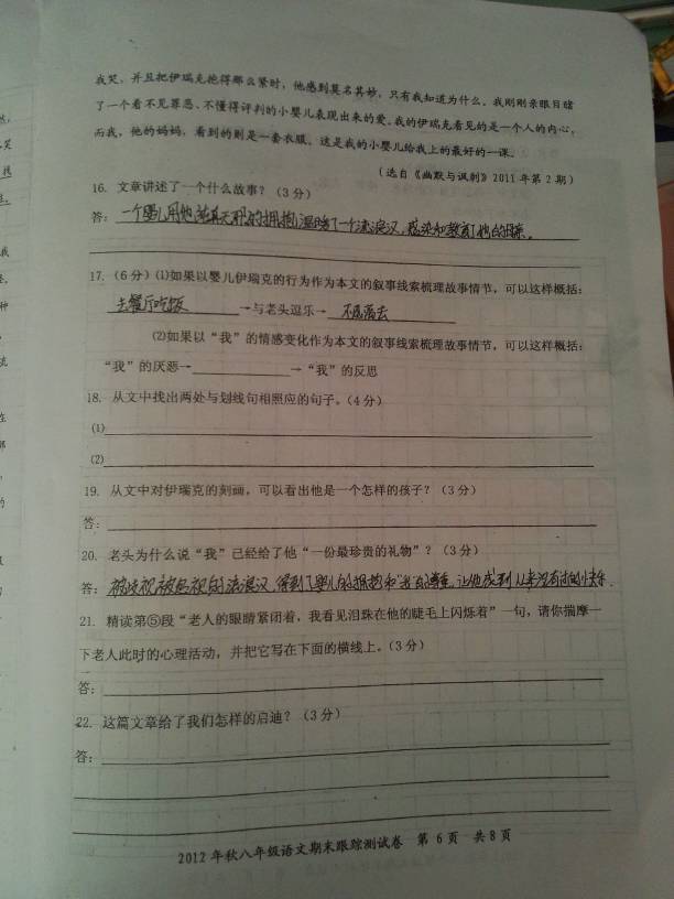 阅读《一个婴儿的拥抱》回答问题。 (1)我们是餐馆里唯一带孩子就餐的顾客,我把伊瑞克放进一把高高的婴儿椅里。突然,伊瑞克高兴地尖叫起来:“嗨,嗨……”并兴奋地用手拍打着椅把。当伊瑞克高兴地咯咯笑着扭动身体时,他的眼睛笑得起了皱纹,嘴巴咧开着,露出了没牙的牙床。我环顾四周,找到了让他快宝且唉乐的根源。那是一个穿着肥大裤子的老头,脚趾头从鞋子里戳出来,衬衫很脏。我们离他比较远,但我相信他身上一定很臭。 (2)那个老头的手挥舞着,“嗨,我看见你了,小家伙。”我和丈夫交换了一下眼神,“我们该怎么办?”伊瑞克继续大笑着回答:“嗨,嗨。”餐馆里的每个人都看着我们,脸色古怪。 (3)我们点生捆的饭菜来了,那个老头大喊:“你们点小馅饼蛋糕了吗?你们知道躲猫猫(一种把脸一隐一现以逗小孩的游戏)吗?嗨,瞧,他知道躲猫猫。”没有人认为那老头是可爱的,他显然喝醉了,我和我丈夫感到很困窘。我们默默地吃着饭,伊瑞克则在为那个欣赏他的流浪汉表演自己的拿手好戏,那个老头把他大大地赞美了一番。 (4)我们终于吃完了饭,丈夫去结账,我抱着伊瑞克去停车场等他。那老头就稳稳地坐在门口。“上帝,让我在他对伊瑞克说话之前顺利地走出去吧。”我在心里祈祷着。当我走近那个老头的时候,我转过身,试图横跨一步躲过他,避免他呼出的空气吹到我们脸上。但是,当我这么做的时候,伊瑞克努力把小小的身体向外斜伸出去,张着胳膊,做出“抱抱我”的姿势。我还没来得及阻止他,伊瑞克就已经从我的怀里向那个老头扑过去了。 (5)一刹那间,一个身上带着臭味的老人和一个充满乳味的小婴儿的爱达到了完美的极致。伊瑞克表现出来的是完全的信任和爱,他温顺地把他的小脑袋靠在老人肩膀上。老人的眼睛紧闭着,我看见泪珠在他的睫毛上闪烁着。他用他充满污垢、痛苦和艰辛劳作的手托着婴儿,抚摸着他的后背。这么短的时间里他们建立起这么深厚的爱,我站在旁边,肃然起敬。老头抱着伊瑞克,轻轻地摇着,用一种坚定的、命令的口吻对我说:“你要好好照顾这个孩子。”我的喉咙里像卡着一块石头,好不容易才说:“我会的。”他颇不情愿地将伊瑞克递给我,看起来非常伤心。我接过伊瑞克,那老头又说:“愿上帝保佑你,大太,你已经给了我一份最珍贵的礼物。”《一个婴儿的拥抱》阅读答案 (6)我除了低声说“谢谢”之外什么也说不出来。我抱着伊瑞克,向汽车跑去。丈夫看到我哭,并且把伊瑞克抱得那么紧时,他感到莫名其妙,只有我知道为什么。我刚刚亲眼目睹了一个看不见罪恶、不懂得评判的小婴儿表现出来的爱。我的伊瑞克看见的是一个人的内心,而我,他的妈妈,看到的则是一套衣服。这是我的小婴儿给我上的最好的一课。扬趋 16、从全文看,本文告诉人们一个怎样的道理?(4分) 17、从文中看,一个衣衫褴褛,满身污垢的老人为什么会获得伊瑞克的“拥抱”?(4分) 18、当文中的老人与伊瑞克开心的逗笑时,为什么“餐馆里的每个人都看着我们,脸色古怪”? (4分) 19、你觉得文中最令你感动的细节是什么?试说说理由。(6分) 我感动的细节: 我的理由: 参考答案: 7、一个人外表的美固然重要,但更重要的是心灵的美,我们应该平等地对待每一个人。(2分) 8、因为伊瑞克天真、纯洁,没有像大人那样用世俗的眼光看待老人,老人与小孩之间流淌的是人世间的纯洁、真诚、信任的爱。(3分) 9、因为餐馆里的人认为,让小孩与这样身上又脏又臭的老人逗笑有辱大人的身份,这反映了餐馆里的人以貌取人的庸俗心理。(3分) 10、示例:伊瑞克从我的怀里扑向那个老人,他温顺地把他的小脑袋靠在老人肩膀上,表现出完全的信任与爱,老人眼含泪水尽情地享受着来之不易的爱。因为这个细节表现了人与人之间的至爱、真情,这种爱是人世间真情的传递,是彼此心与心的相融。(4分)《一个婴儿的拥抱》阅读答案