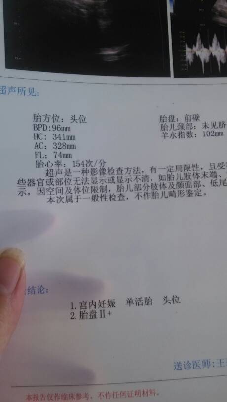 从提供的b超报告看,现在是胎位,胎心率和羊水量在正常范围内。双顶径96mm略偏大。现在胎盘还是2级,建议暂时观察,增加检查次数。