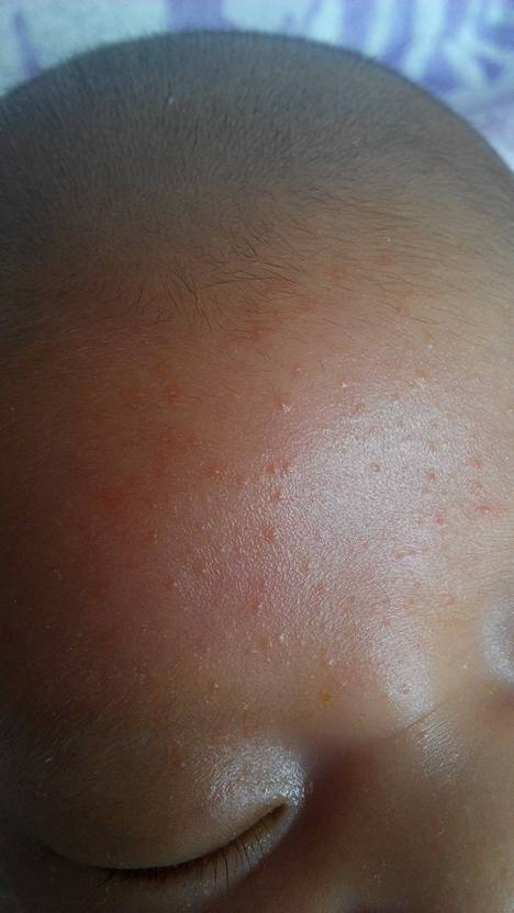 宝宝额头和脸上都起了红色痘痘,还有白色的点点,像粉刺,是湿疹吗?该抹什么药?具体名字…