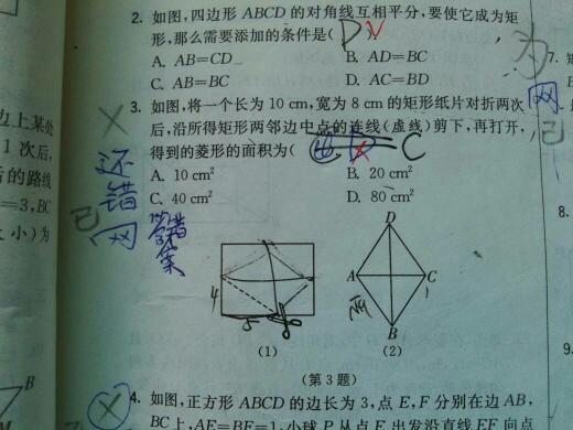是c菱形面积公式就是对角剑揭铜线乘积的一半。现在菱形糕它的对角线就是矩形的长宽,所以就是八十的一半就是四十。告诉孩子,其实很多参考答案都有错的,不要太过于相信答案,有异议就提出,和老师捆医探讨