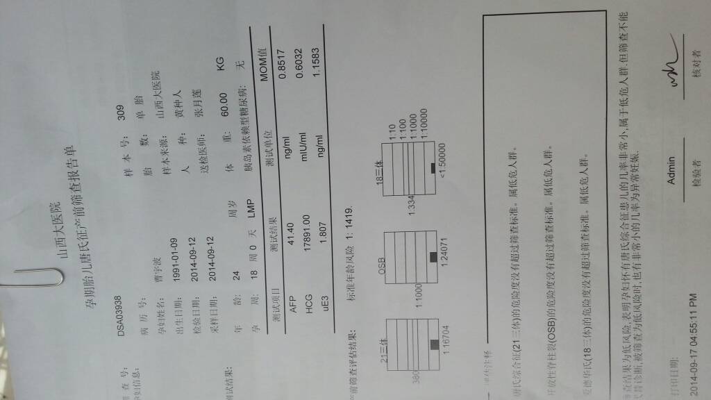 大家谁能告诉我,这个唐筛检查结果正常吗? 大家谁能告诉我,这个唐筛检查结果正常吗? 点击展开 133*****028_7OVd 2014-09-29 10:11 为您推荐: 其他回答 不客气的。。 丟掉任性 @做伱の♀女人 2014-09-29 13:49 医生说没事就没事!但是如果他说需要什么进一步检查的就没必要。。。。坑钱的 丟掉任性 @做伱の♀女人 2014-09-29 11:40 您好,您的唐氏筛查检查,指标都是正常的,综合评估结果都是低风险的,也就是说患病的可能性非常小。 匿名用户 2014-09-29 11:13 都是低风险就没事,有点看不清 小宝宝宣宣 2014-09-29 11:02 低危没事。 152*****328_Nddo 2014-09-29 10:48 加载更多 相关问题 唐筛检查结果大家帮忙看看我这个是正常的吗 去医院做唐筛,检查结果出来乙肝表面抗体呈弱阳性,可标本状况显示正常,对宝宝有影响吗? 我最爱的宝宝,妈妈祈祷你健康平安聪明,不在乎男女,只求你好好的,我宝要乖,希望检查结果一切都好,唐筛一定要过关,宝宝,要一直陪着妈妈