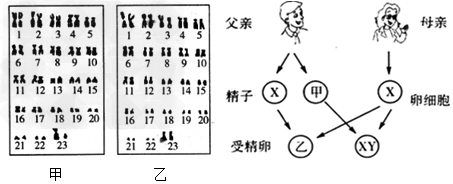 图1为男女体细胞的成对染色体排序图,图2是生男生女示意图。请分析回答: 图1 图2 (1)染色体是细胞内容易被碱性染料染成深色的物质,它主要是由蛋白质和 组成的。由图可知,在男性、女性的体细胞中各有 条染色体。(2)细胞内与性别决定有关的染色体称为性染色体,在男性、女性的体细胞中各有 对性染色体,图1中的 图表示男性的染色体排序。 (3)精子是由父亲的 产生的,图2中精子甲的性染色体是____ 染色体。(4)受精卵是在母亲的 内发育成胎儿的,图2中受精卵乙发育成的胎儿性别是 性。