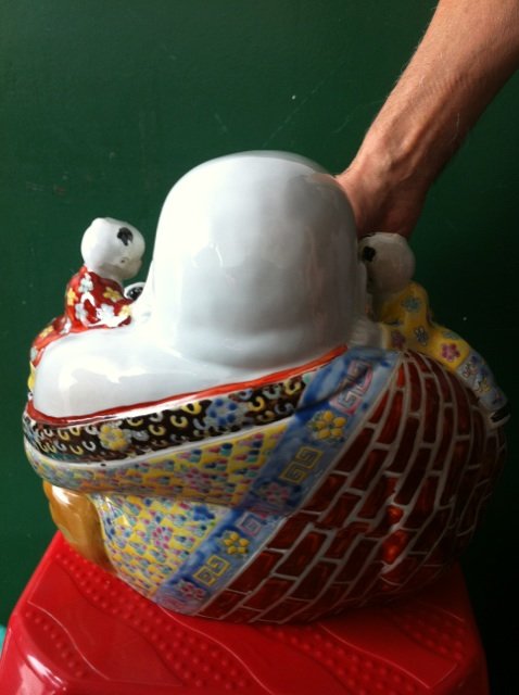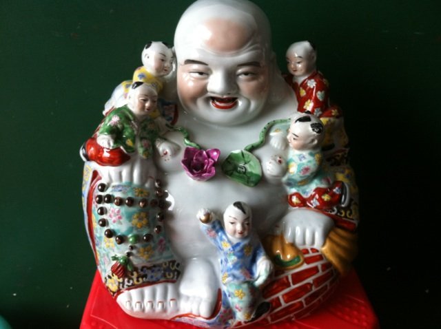 弥勒佛身上五个小孩的瓷器,造型生动栩栩如生!底部有福建会馆的款,请问是否真品价值如何?请高人解答!