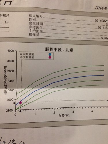 宝宝104天测的骨密度,测量部位胫骨中段,SOS值为2930米每秒,Z值为-.3,百分位数为40 宝宝104天测的骨密度,测量部位胫骨中段,SOS值为2930米每秒,Z值为-.3,百分位数为40,请问这种情况正常吗?需要补些什么? 点击展开 匿名用户 2014-08-25 20:49 为您推荐: 其他回答 你好,这时候是要自己注意尽量的给宝宝补充一点钙剂的呢,这样是会好的啊,自己看看的呢 生活还在继续66 2014-08-26 10:01 相关问题 13个月的宝宝,做了骨密度检查,测量部位胫骨中段,SOS值…3238米、秒,Z值…3,百分位数62 男1 宝宝9个半月,骨密度z值4,sos值 宝宝1岁1个月,最近发现平躺时肋骨有凸出,去做骨密度,SOS值3342 Z值-0 8百分位23