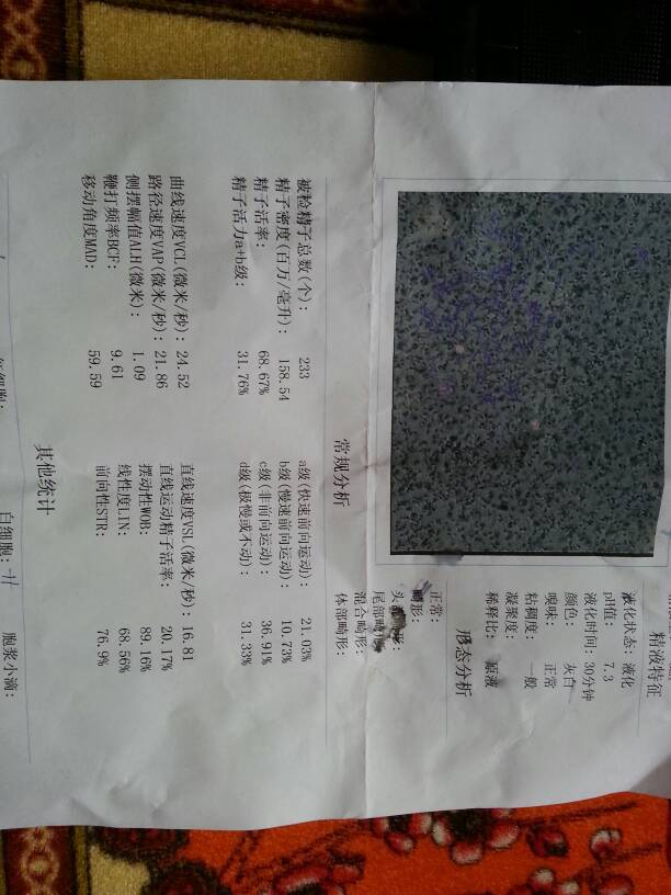 精子检查结果 A级21% b级10% c级 36% d级31%可以怀孕吗,请高人指点 点击展开 匿名用户 2015-05-15 18:21 满意回答 受精某扬卵惑用是由个数质量高的精子布贵概和卵子结合而成!要自信!一切皆有可能!祝幸福~ 东郭灵慧_eGp2 2015-05-15 18:24 宝宝知道提示您:回答为网友贡献,仅供参考。 为您推荐: 其他回答 可以…女人受孕期男人只要不是太累…同房基本都能怀孕 匿名用户 2015-05-15 18:23 可以,不过不好受孕 匿名用户 2015-05-15 18:22 相关问题 精子检查结果 a级1% b级6% c级3% d级90%,能够正常怀孕吗? 精子常规 这个检查结果影响受孕吗 请高人指点 a级精子23%,b9%,活动率33%,这个质量怀孕还差多少啊,求高人!