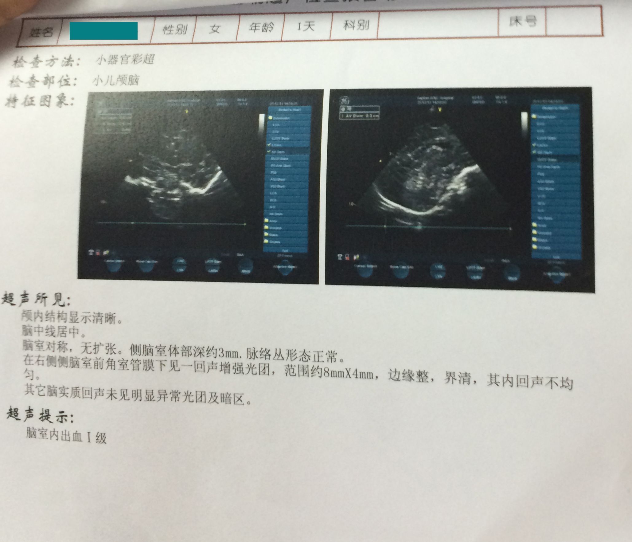 新生儿颅内出血一级,以及心脏(心房)上有两个小孔 具体见附件