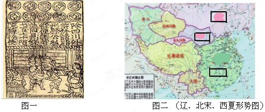 (1)交子;北宋;; (2)从上到下:CBA 试题分析:17、本题考查学生的识图能力。图一是当时世界上最早的纸币——交子,在北宋四川唤贵最堡耻地区,由于商品经济的发展,而当时四某串川通用的铁钱不便于流通,故当时的一些商人便首先推行了纸币交子。18、本题考查学生对历史地图的识记能力。辽、西夏和北宋是当时并立的三个政权,其中辽最早建立,位于北部,宋占据黄河流域,而西夏位于今甘肃一带,故由上到下应填辽、西夏、北宋。