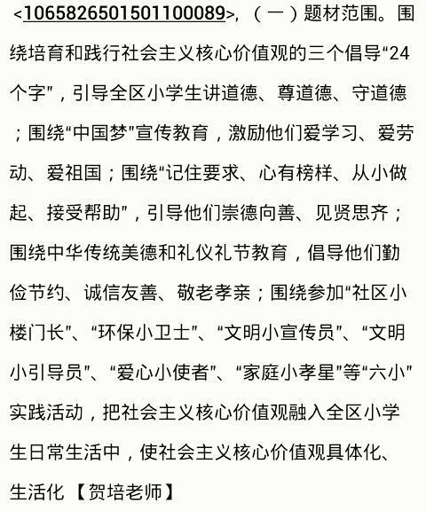祖国妈妈四胞胎,能文能武个个乖,“富强”“民主”冲在前,“文明”“和谐”跟着来。社会是个大家庭,相亲相爱一家人:“自由”“平等”很活跃,“公正”“法治”很严谨。我是一个好公民,爱党“爱国”爱人民,又“敬业”,又“诚信”,对人“友善”四季春。