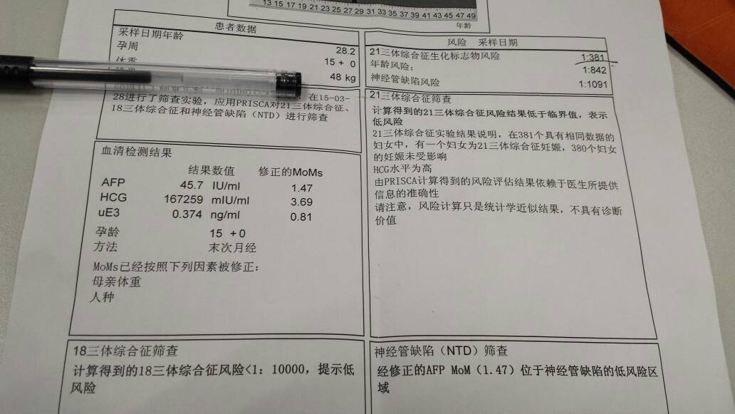 大家帮忙看看我的唐筛报告,显示的是HCG高达167259mlu/ml,医生说很高,建议做羊水穿刺这