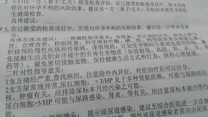 孕前优生健康检查结果及评估建议,中有五条是 说女性痛经,尿常规异常,尿红细胞>3/HP,白细胞增
