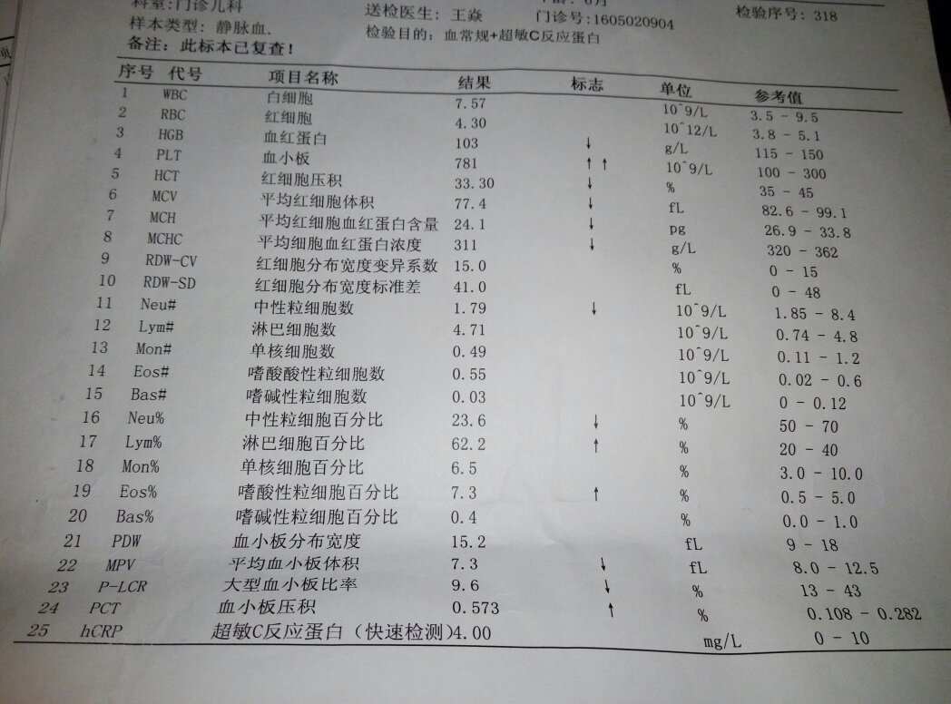 宝宝刚7个月之前住院抽了很多血,现在贫血了 血常规结果如下,:血红蛋白101.0,红细胞压积0.2