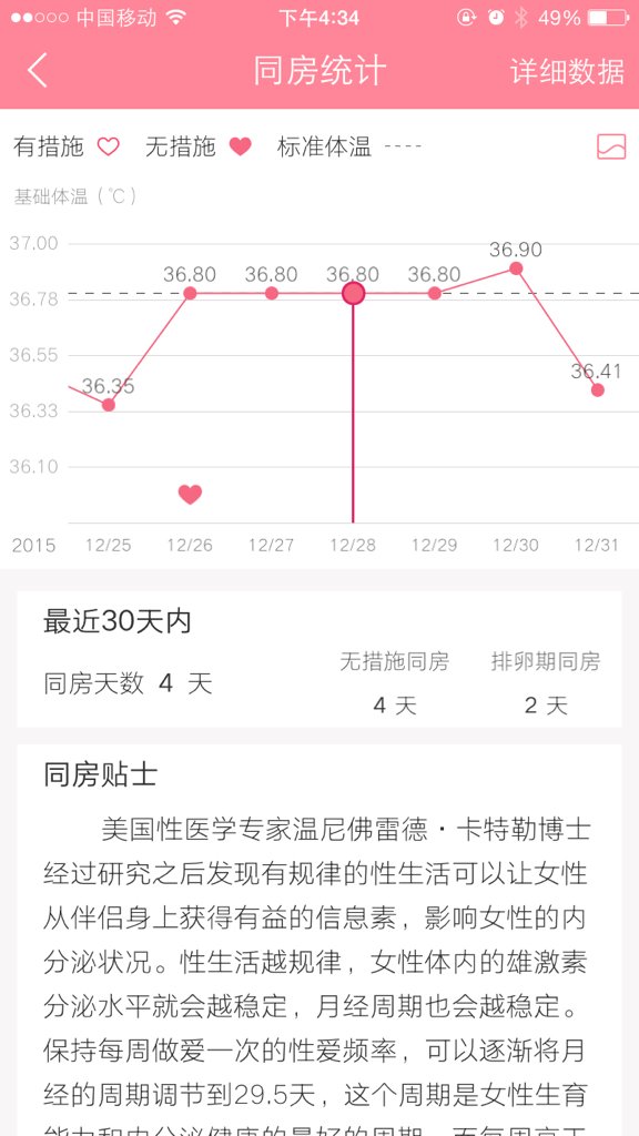 25号排卵日,24,26都有同房 同时在监测基础体温,体温如下,是怎么回事呢,确定着床了吗 点击展开 匿名用户 2015-12-31 16:35 满意回答 你好!排卵昌峡期是本月的二十五号,24和26号都有同房,怀孕的机率比抓沙较高。基础体温不能知患串高道着床情况。 wz673 2015-12-31 17:04 宝宝知道提示您:回答为网友贡献,仅供参考。 相关问题 请问测基础体温测排卵日,今天月经后第十四天,测体温是不是突然变最低是排卵日吗 排卵日同房第四天出血了,颜色鲜红,量不大,是着床出血吗? 基础体温忽高忽低,请帮我看看哪天是排卵日?