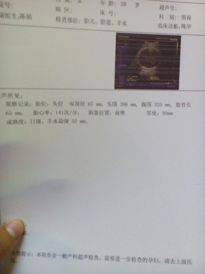 算宝宝体重:双顶径87mm,头围306mm,腹围325mm 算宝宝体重:双顶径87mm, 头围306mm, 腹围325mm, 股骨长65mm 点击展开 😊☺️😉 2015-11-16 11:00 为您推荐: 其他回答 五斤多,, ^O^ bitter gourd ^O^ 2015-11-17 00:35 要医生算算 翔宝宝! 2015-11-17 00:07 六斤多了, 妖娇性感的小妖 2015-11-16 21:02 不会算哦, Lipstick_B3Hg 2015-11-16 17:25 有五六斤了 此生何求 2015-11-16 14:04 加载更多 相关问题 双顶径87mm头围315mm腹围325mm股骨长72mm宝宝有多少斤 彩超中的双顶径87mm,是指胎儿的哪个部位,彩超中的周数会根据胎儿的体重变化吗? 双顶径87mm 头围322mm,腹围330mm,FL68mm怎么算胎儿体重