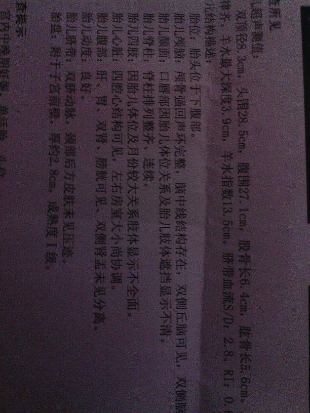 35周b超图 求看看胎儿发育如何 大概多重 点击展开 匿名用户 2015-03-07 22:35 为您推荐: 其他回答 你好,根据你提供的信息目前胎儿发育正常,建议孕期合理膳食,均衡营养,多食富含蛋白质,维生素丰富的食物,注意休息,定期检查。宝宝的体重大约在2270克。 五彩缤纷20143 2015-03-07 23:24 相关问题 如何看彩超数据,35周,请帮我看看胎儿发育好不好,有多重,是男孩还是女孩,接下来需要做些什么? 我老婆怀孕了35周天天玩手机会不会对胎儿发育影响啊 2014年1月21末次月经,5月3日的B超结果,看看胎儿发育是否正常?几个月了?