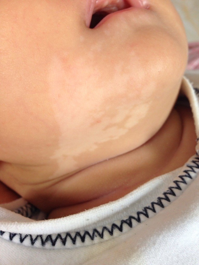 宝宝两个月了,脖子上的白斑好像越来越宽了,一个多月的时候去医院,医生说没事的是吃奶的时候泡的,可是