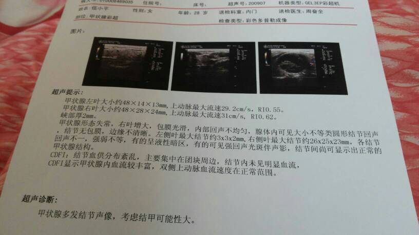 有医生在吗?帮我看看这张B超严重吗?谢谢了 有医生在吗?帮我看看这张B超严重吗?谢谢了 点击展开 明粤妈妈 2014-11-18 11:27 为您推荐: 其他回答 指导意见:你好,甲状腺内有结节,常见的原因是甲亢、甲减、甲状腺肿瘤等引起的,需要在做相应的检查明确诊断。 ke1008 2014-11-18 15:10 ……………… 麻麻的点点 2014-11-18 15:05 相关问题 哪个医生帮我看看这张B超 请医生专家帮我看看这个检查结果严重吗?需要做什么治疗,有智力影响吗?这是宝宝出生25天做的头部b超 宝宝在肚子里,脐带挂在宝宝脖子上面,还能顺产吗,医生帮我看看这个B超单