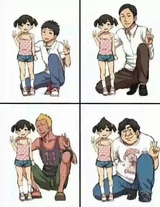 这个我看过,觉得最靠谱的是第四个。 仔细看她的头,还有那个胖大叔的衣服。不用想了——小女孩已经死了,她背后有个支架。胖大叔是个变态。