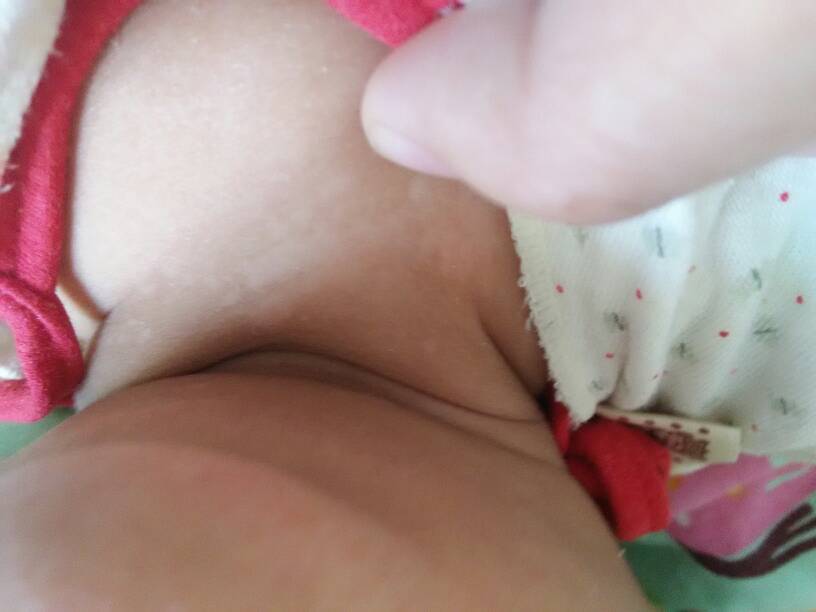 看我宝脖子底下的白色的是什么?原来是红色疙瘩,擦了药膏就成白的了,是奶癣吗?