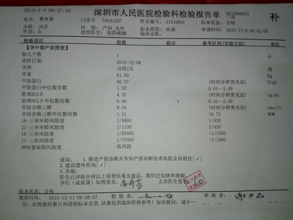 中唐 HCG中位数倍数偏低,医生建议去做羊水穿刺,到底怎么办 中唐 HCG中位数倍数偏低,医生建议去做羊水穿刺,到底怎么办 点击展开 Hancy_Wang_hx 2016-01-04 13:50 为您推荐: 其他回答 不一定准确,羊水穿刺是有创伤性的,最好换家医院再看看 lulu_RaU3 2016-01-04 14:00 羊水刺穿也有危险。,多问几家医院 洪陈玉轩 2016-01-04 14:00 听大夫的。。 玥蓉妈妈 2016-01-04 13:57 没事儿,, 雨萱最漂亮 2016-01-04 13:55 去做一下吧 以为你以为的就是 2016-01-04 13:55 加载更多 相关问题 HCG中位数倍数(MOMF)是2 77,NTD的结果显示低风险,这是正常的吗?被医生的话吓到了,没 唐氏筛查结果HCG中位数倍数偏高有必要做羊水穿刺吗2 69 唐氏筛查结果B-HCG中位数倍数偏低需要做羊水穿刺吗?
