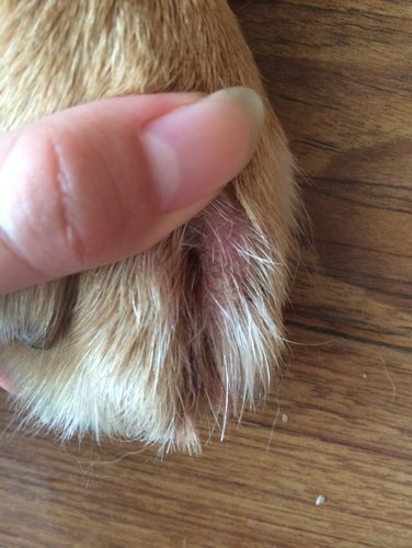 八个月金毛!刚刚一直在舔脚!我仔细一看右后脚丫一小块已经掉毛 而且泛红起皮屑了!前几天刚刚做过体内
