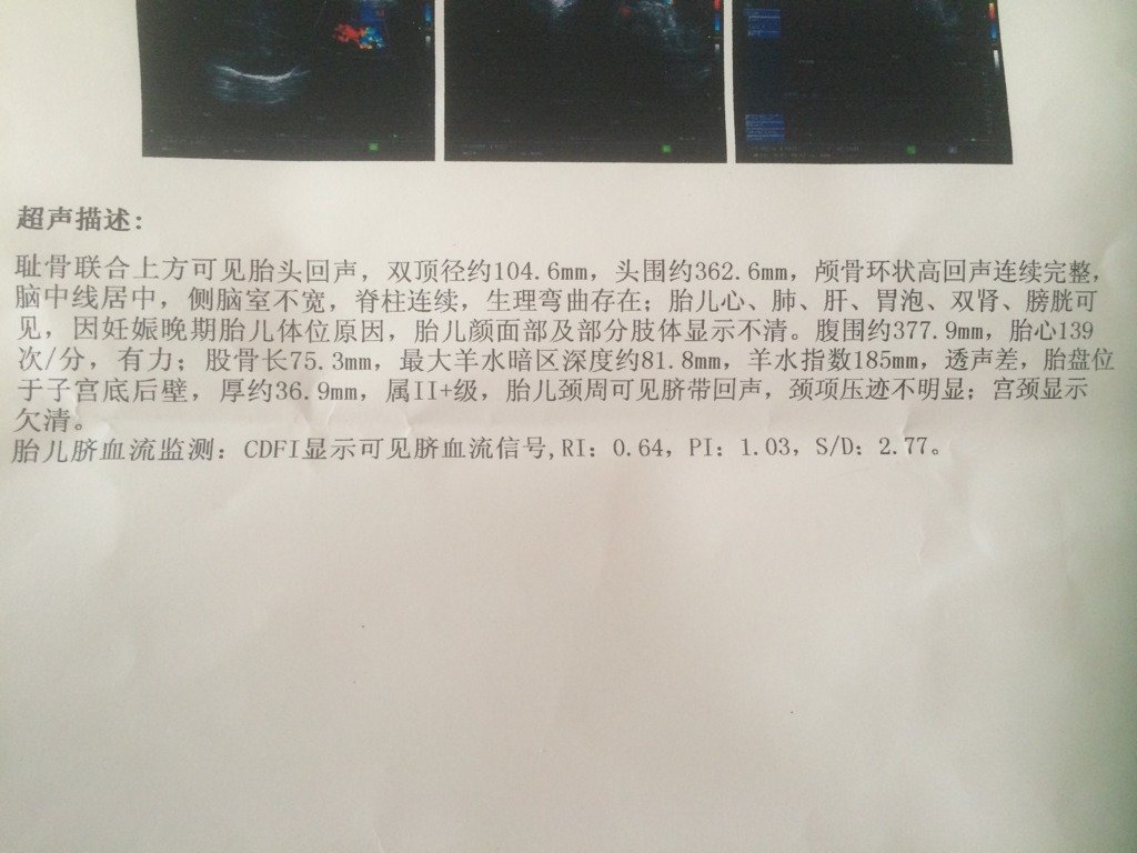 今天是怀孕40周+3天 这是今天照的彩超、请各位帮忙看看 我想顺产、风险大不大? 今天是怀孕40周+3天。这是今天照的彩超、请各位帮忙看看。我想顺产、风险大不大? 点击展开 自定义* 2014-09-01 16:37 为您推荐: 其他回答 还是刨腹产吧 很危险 🌙宝宝贝贝☀ 2014-09-02 10:45 你好,一般根据你这样的情况可能顺产也不是很好,因为这个时候你家宝宝的头部很大,你自己看情况吧! adfaffq 2014-09-01 16:38 相关问题 孕35周6天做的彩超检查,请各位帮忙看看能否顺产? 请问专业医生,怀孕7周,彩超未见原始心管博动,附彩超报告单一张,今天在医院做的,这种情况小孩还能保 今天做了彩超医生说孩子有七斤多,到底是要顺产还刨妇产呢?