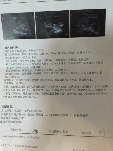 求求你们救救我孩子、怀孕4个多月!双包胎、有一个胎儿膀胱厚度5.9mm.输尿管扩张 腹腔大量积液
