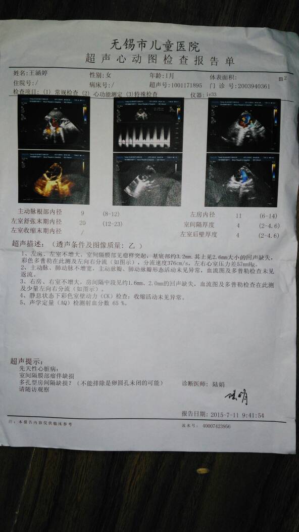 宝宝先天性心脏病 超声提示: 室间隔膜部瘤伴缺损多孔型房间隔缺损?(不能排除是卵圆孔未闭