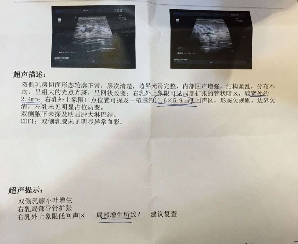 小叶增生和乳腺癌会不会同时存在于一个乳房里?我的右乳经前半个月很疼B超检查出有小叶增生但是右外 小叶增生和乳腺癌会不会同时存在于一个乳房里?我的右乳经前半个月很疼 B超检查出有小叶增生 但是右外象上限有一个一厘米左右的形态欠规则边界欠清的低回声区,我很怕是恶性肿瘤,但是恶性肿瘤一般不疼 我的感觉不到疼不疼因为和小叶增生在一起 小叶那疼 就感觉不到那个小肿块疼不疼 点击展开 SIVANXIXI 2015-07-06 10:12 推荐回答 你好残贵!别担心如锅狗果不确定可以做钼靶检查看一下,钼靶确诊率比B超高很多键眠夕。 饶谷蕊 2015-07-06 10:15 宝宝知道提示您:回答为网友贡献,仅供参考。 相关问题 问: 5 小叶增生和乳腺癌会不会同时存在于一个乳房里?我的右乳经前半个月很疼B超检查出有小叶增 乳房小叶增生和乳腺癌...急... 生完宝宝七天了,奶涨得很疼,但是宝宝吸不出多少,吸奶器也吸不出来,我以前有点乳房小叶增生,怎么办