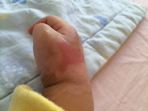 请问七个半月小孩烫伤在手背,是深二度,粥烫的大夫说肯定要留疤,暂时有一点要增生迹象,现在一直摸药
