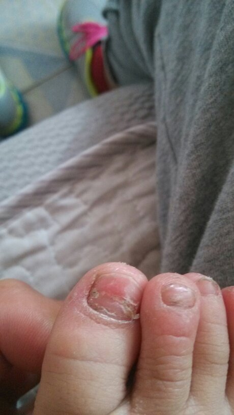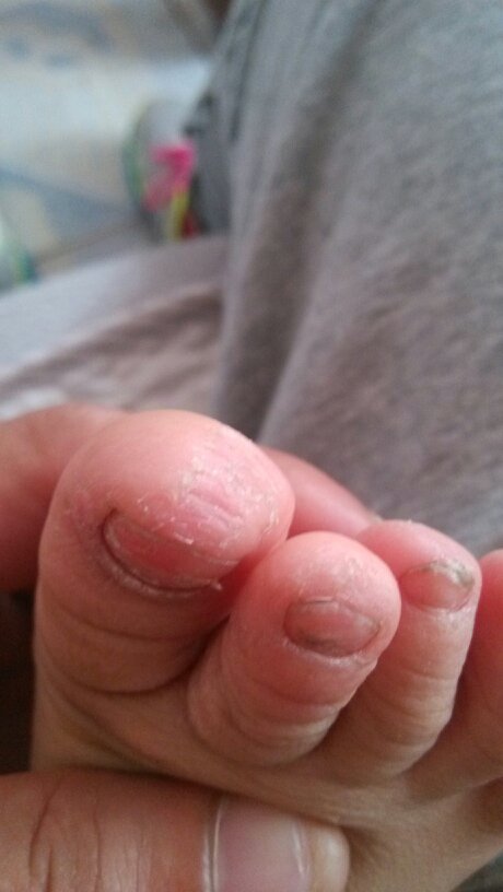 孩子今年5岁,最近发现右脚三个脚趾甲起层发白处可用手抠开,而且还褪皮 麻烦大家看一下是什么原因 谢