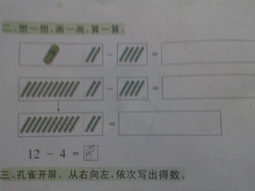 其实,第一道会不会是一捆代表10个,第一个大格子分两个小格子.那就是12-4=8 之后第二个的大格子里面也有两个小格子,前面是10 后面是2, 还是12-4=8 之后有个箭头跑到第三题.第三题的大格子前面是10根,后面是2根,答案就是12 不知道对不对,纯属判断.