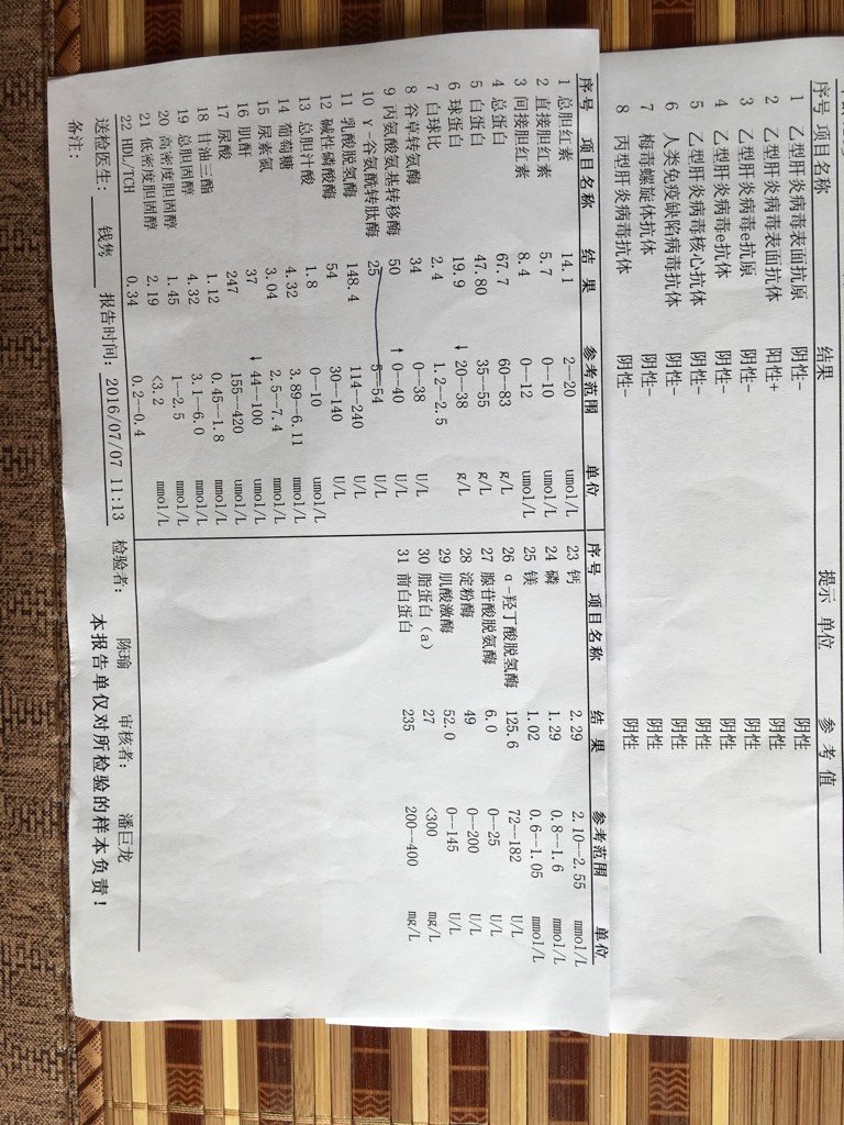 抽大血报告,麻烦专业的帮忙看看,谢谢 抽大血报告,麻烦专业的帮忙看看,谢谢 点击展开 Aminbaby 2016-07-14 11:24 为您推荐: 其他回答 血型不一定一样啊,正常的,肝功能没有太大问题,复查就可以了 Ϲ˵ǰ׳ 2016-07-14 11:34 问问医生吧 186*****605_Qkym 2016-07-14 11:30 你好,验血报告显示没有乙肝,有抗体,谷丙高一点点,可能与感冒,发烧吃药等有关,没有大问题,可以复查一个 Ϲ˵ǰ׳ 2016-07-14 11:29 问医生。。。。 心的诺言 2016-07-14 11:28 阴性是好的 筱莉莉 2016-07-14 11:27 加载更多 相关问题 医生下班了,拿到报告问的医生都不是专业的,麻烦帮忙看看正常吗 请帮忙看看我5个月大宝宝的血细胞分析报告~是否贫血?谢谢 麻烦各位帮忙看看这份报告单,能详细说一下吗